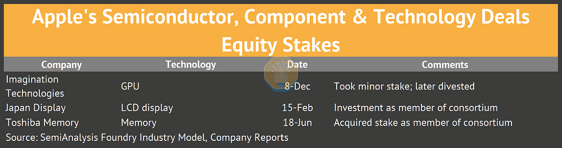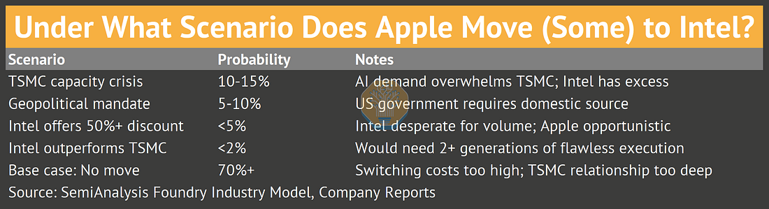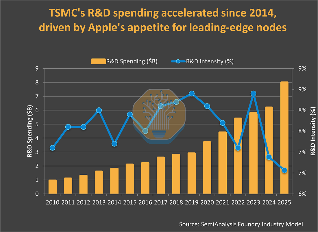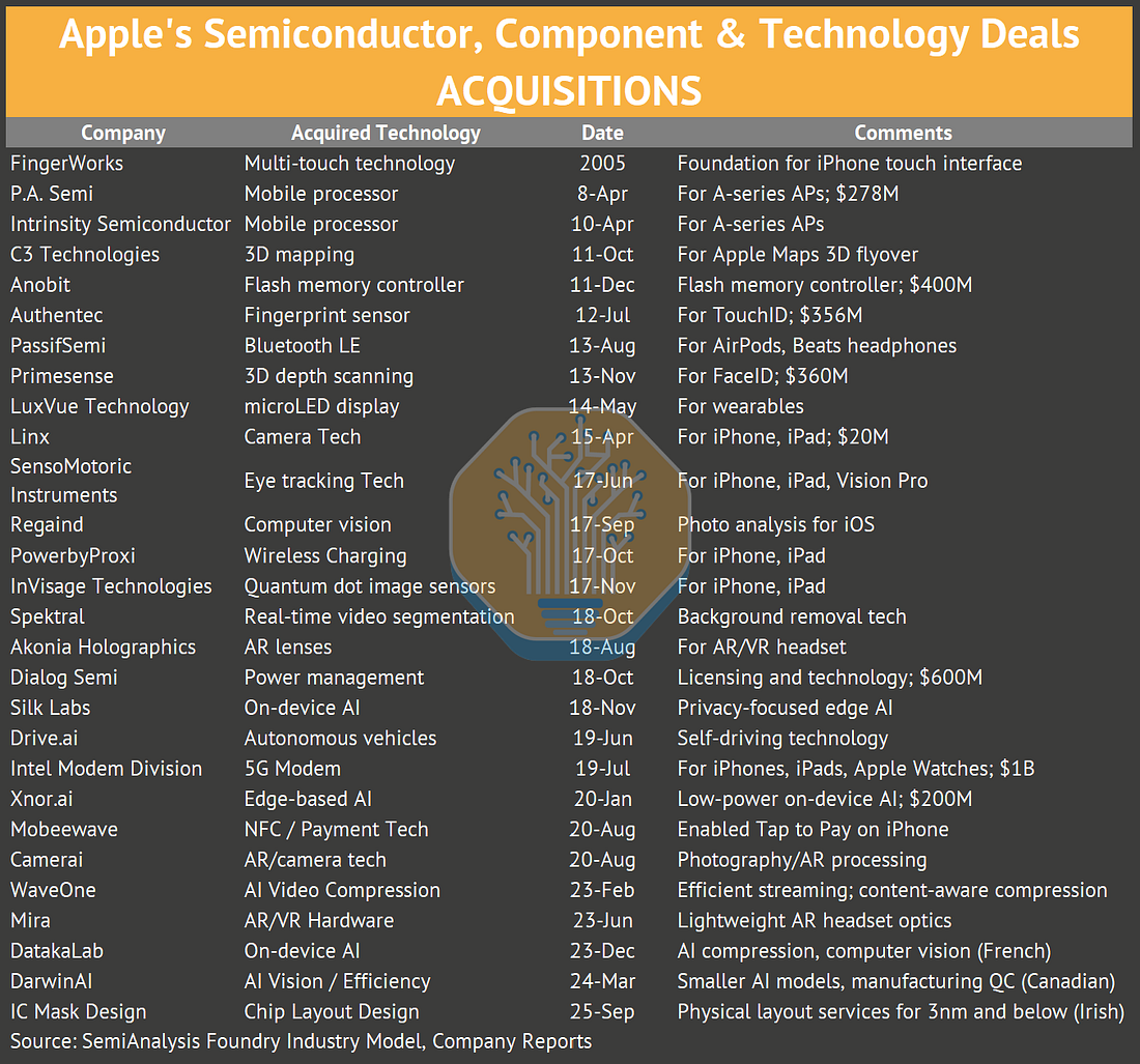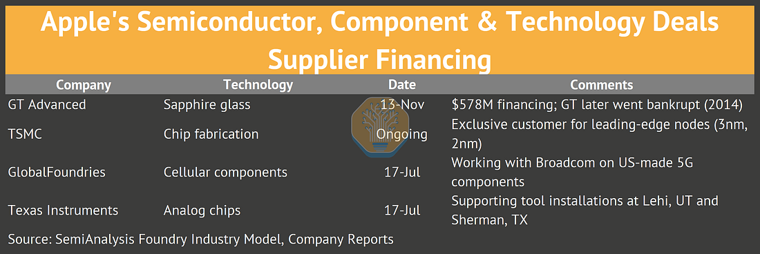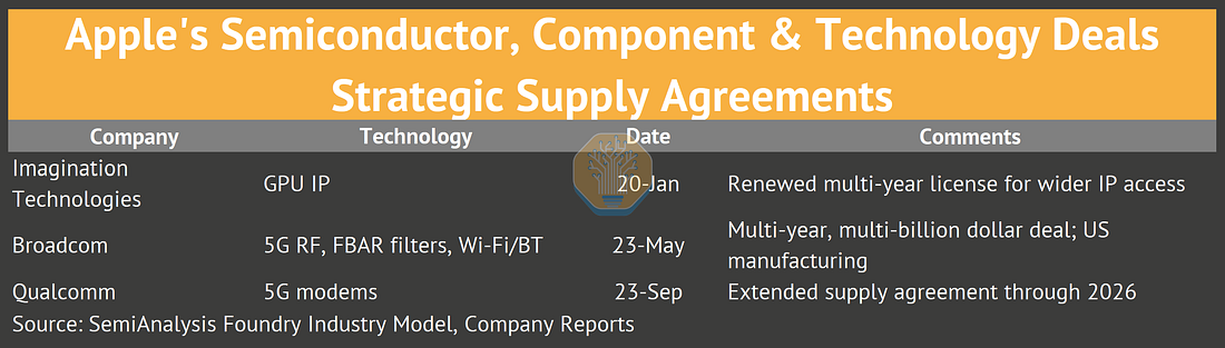 Apple-TSMC: The Partnership That Built Modern SemiconductorsWafer demand model, node economics, and the shifting power dynamics as AI reshapes the foundry landscapeIn 2013, TSMC made a $10 billion bet on a single customer. Morris Chang committed to building 20nm capacity with uncertain economics on the promise that Apple would fill those fabs. “I bet the company, but I didn’t think I would lose,” Chang later said. He was right. Apple’s A8 chip launched in 2014, and TSMC never looked back. Apple’s annual spend at TSMC grew from $2B in 2014 to $24B in 2025. That is 12x in 12 years. Apple went from 9% of TSMC revenue to 25% at its peak and settled to 20% in 2025. More striking is Apple’s dominance at node launches: consistently >50% since 20nm and in some cases near 100%. Apple effectively funded the yield learning curve for every major node transition since 20nm. The foundry model is dominant today. IDMs cannot support process development and fab capex with what is effectively a single customer. But even foundries need a “first and best” customer with large demand and deep pockets to fund their continued advance. Apple has been that customer for the last decade at TSMC. The juggernaut partnership has propelled both companies to new heights, put competitors in the dust, and fueled the chipmaking industry. This report traces the Apple-TSMC relationship from Intel’s 2010 rejection through five distinct phases, examining how Apple built its chip empire through acquisitions and 8,000+ engineers across 15 design centers. We analyze why competitors have failed to replicate this vertical integration, map Apple’s manufacturing footprint across Fab 18 and advanced packaging facilities, and assess the strategic questions facing both companies as Intel 18A and Samsung re-engagement become viable alternatives. We’ll also discuss the next phase of the relationship. It’s not just Apple at the leading edge anymore. All of this is quantified with specifics from our proprietary Foundry Industry Model and Apple Wafer Demand Model. Anchor TenantYou can see the Apple effect in TSMC’s capex trajectory. Pre-Apple (2005-2009), annual spending averaged $2.4B with no anchor tenant to de-risk investment. From 2019-2022, TSMC deployed $98B, exceeding the cumulative spend of the prior 14 years. Apple’s manufacturing purchase obligations scaled from $8.7B in 2010 to $71B in 2022. TSMC-specific payments grew from near-zero in 2013 to $23B+ in 2025. For over a decade, Apple was the only company capable of pre-funding bleeding-edge capacity at scale. That changed with Nvidia’s AI-driven cash generation. Today, two companies can fund TSMC’s roadmap. The platform shift has already happened. HPC revenue at TSMC grew from 36% in 2020 to 58% in 2025. Smartphone revenue shrunk to 29% from 46%. Our model shows Nvidia will consume more N3 wafers than Apple by 4Q27. Apple’s share of N2 drops to 48%, the first time in a decade Apple is not the dominant customer on a new node. Consensus sees this as permanent displacement. Our model says otherwise. TSMC’s A16 is architected for HPC. Backside power delivery, gate-all-around transistors, and thermal envelopes are optimized for HPC and smartphones will skip this node. Nvidia benefits disproportionately. Apple’s N2 (N2 + A16) share drops not because Apple lost leverage, but because the node was built for a different customer. A14 (1.4nm) rebalances the equation. TSMC is designing A14 for both mobile and HPC from the start, with a separate backside power (TSMC’s trade name is Super Power Rail) variant for HPC. Our model shows Apple reclaims 67% node share on A14, its highest since N3. Apple is not standing still. New chip families (N-series, C-series) account for 15% of wafer demand by 2030. iPhone’s share of Apple’s wafer mix fell from 74% to 57% as Mac silicon and custom chips scaled. Gross margins reflect in-house silicon transition. Mac GM expanded from 28.5% to 39.5% after ditching Intel, an 11-percentage point expansion. iPhone GM grew 5 percentage points from A4 to A18. Annual chip savings exceed $7B across Intel, Qualcomm, and Broadcom displacement. Apple has driven $300B+ in supplier capex over the past decade, building a supply chain empire that spans Foxconn, ASML, and dozens of precision manufacturers. What This Analysis Covers The analysis is built on two proprietary models. Our Foundry Model tracks revenue, wafer shipments, and capacity allocation, quantifying the platform shift where smartphone revenue fell from 46% to 29% while HPC rose from 36% to 58%, and how Apple’s purchase obligations grew from $8.7B to $71B. Our Apple Wafer Demand Model forecasts silicon demand across chip families (A-series, M-series, S-series, N-series, C-series etc.), calculates gross margin savings exceeding $8B annually, and projects Apple’s leading-edge share declining from near 100% at N3 to <50% at N2 as AI accelerators reshape allocation. The report concludes with Taiwan risk scenarios, Arizona economics, and conditions under which Apple would build its own fabs. Key NumbersWafer Demand · A-series: $4.2B (2018) to $9.7B (2025) = 131% growth · M-series: $0 (2019) to $4.9B (2025) = From zero to $5B in 6 years · S-series: $86M (2018) to $342M (2025) = 4x growth · Total Apple Silicon Revenue: $23.5B (2025) TSMC Transformation: · Revenue: $13B (2010) to $122B (2025) = 9.4x growth · R&D: $1B (2010) to $8B+ (2025) = 8x growth · Capex: $5.9B (2010) to $41.4B+ (2025) = 7x growth · Gross Margin: 45.5% (2010) to 59%+ (2025) = 13.5pp expansion The Packaging Revolution: · CoWoS Revenue: $0.6B (2018) to $8.4B (2025) = 14x growth · Apple InFO Revenue: $3.5B+ (2025) · TSMC Advanced Packaging as % of Revenue: 6-7% (2018) to 10%+ (2025) Apple’s Supply Chain Leverage: · Manufacturing Purchase Obligations: $8.7B (2010) to $56.2B (2025) = 6.4x growth · Monthly Wafer Demand: 19K (2013) to 130k (2025) = 7x growth · Fab 18 Customers: 4 (2020) to 45 (2