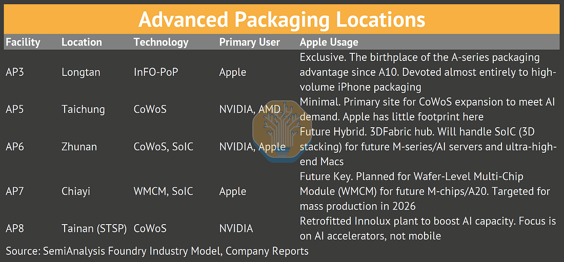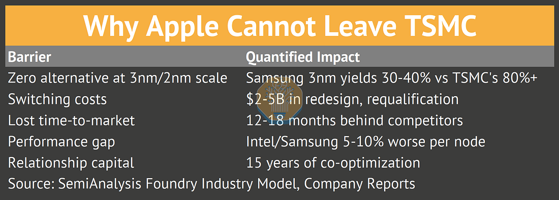 At the core there are cultural differences: Intel, trapped in its product success, couldn’t foresee the massive Arm-based foundry market; TSMC offered servitude, flexibility, and a willingness to ‘bet the company’ on Apple’s success. TSMC built dedicated capacity, accepted Apple’s engineers into their labs, and aligned their roadmap with the iPhone’s annual cycle. This cultural alignment, TSMC’s willingness to customize versus Intel’s standardized product approach, remains Intel’s biggest hurdle in its IDM 2.0 pivot today. Apple initially said to have offered 40% gross margin to TSMC, which was in line with TSMC’s margin then. Current gross margin from Apple business is significantly higher than the initial 40%. Despite investing in dedicated 20nm capacity for Apple, TSMC did not even receive a majority share of Apple’s foundry business at first. It had to share a 14nm slot with Samsung in 2015 with the latter getting >60% share. TSMC management was shocked, but responded by accelerating their next-gen 10nm process. Ultimately, TSMC won because it demonstrated the ability to scale 20nm ahead of the competition, proving it could handle the iPhone’s massive volume spikes. The “Night Hawk” team at TSMC worked 24/7 to solve yield issues, establishing the operational trust that persists today. What if Apple chose Intel in 2014? Intel would have $15B+/year guaranteed foundry revenue. TSMC, without that revenue, would probably not have achieved dominance anywhere near what it has today. Intel Foundry would be 10 years more mature. It’s the biggest misstep in the history of chip foundries. Phase 3: Mutual Lock-In (2020-2023)By 2020, the partnership had evolved from mutually beneficial to co-dependence. Apple could no longer leave. No other foundry on earth could produce M-series and A-series chips at the required volume and yield. Samsung’s 3nm yields were 30-40% versus TSMC’s 80%+. The switching cost was estimated at $2-5 billion in redesign and requalification alone. TSMC could not lose Apple. The iPhone brought 22-25% of total revenue and filled 70%+ of 3nm capacity. Apple orders were known three years in advance, allowing TSMC to plan capex with the confidence of a utility company. A more serious risk is timing. Apple’s product cadence is synchronized to TSMC’s node roadmap. Moving to Intel or Samsung would mean 2-3 years of inferior products while yield learning catches up. Product upgrade cycles, most importantly the annual iPhone refresh synced with holidays, would also be at risk. Phase 4: Diversified Dependence (2023-Present): The Changing Power Dynamic: Is Apple Still the Kingmaker?For years, Hsinchu and Cupertino worked as a single team to relentlessly advance Moore’s Law. Apple’s One Team approach embedded hundreds of engineers at TSMC’s headquarters, effectively treating the foundry as an extension of Cupertino. This team co-developed Process Design Kits (PDKs), ensuring that when a new node like 5nm launched, Apple’s designs were perfectly synthesized to the transistor characteristics. However, the rise of generative AI is shifting TSMC’s customer mix. While Apple remains the largest single customer by revenue, its relative influence is diluting as the High-Performance Computing (HPC) segment, driven by NVIDIA, AMD, and hyperscalers, outgrows. In Q1 2020, smartphones accounted for 49% of TSMC’s revenue, while HPC was 30%. By Q3 2025, HPC had skyrocketed to 57%, relegating smartphones to a secondary growth driver. While Apple also contributes to TSMC’s HPC segment through its tablet/PC chips, the uptake of AI offered TSMC a new stream of customers who are voracious for advanced node capacity. While AI accelerators moved 1 year cadence, they are still on n-1 node largely. Apple will still be the anchor customer on N2 (2nm) but it will see stiff competition from others competing for capacity. On A16 (1.6nm), HPC players are likely to beat Apple as it is a more HPC centric node. Apple acts as the predictable baseline that justifies the massive, fixed costs of new fabs. NVIDIA provides the high-margin upside that drives profitability growth. TSMC now has two anchor tenants instead of one. The AI Divergence: Wafers vs. PackagingThe distinction lies in what these customers are buying. Apple buys leading-edge logic wafers (N3, N3E) and InFO (Integrated Fan-Out) packaging. NVIDIA buys logic wafers (N4, N5) on a custom process a node or 2 behind leading edge but is critically dependent on CoWoS (Chip-on-Wafer-on-Substrate) packaging. Apple was TSMC’s first advanced packaging customer at scale. InFO revenue grew from $1.8B in 2018 to >$3.5B in 2024, driven entirely by A-series and M-series chips. But CoWoS, TSMC’s AI packaging platform, has surpassed it. CoWoS revenue hit $9.6B in 2025, 2.5x InFO, fueled by Nvidia and AMD demand. This creates a bifurcation in TSMC’s capacity planning. Apple is no longer the sole driver of capex. TSMC’s capital expenditure is now split between chasing Moore’s Law (2nm for Apple) and chasing packaging density (CoWoS-L for NVIDIA). Apple acts as the predictable baseline that justifies the massive fixed costs of new fabs, while NVIDIA provides the high-margin upside that drives profitability growth. The power dynamic has shifted from a unipolar world (Apple) to a bipolar world (Apple + AI), where TSMC can now arbitrage demand between the two sectors to maintain pricing power. Phase 5: Beyond TSMC (2027+)Apple is actively exploring alternatives. Intel’s 18A-P process (shipping late 2026) represents the first theoretically viable alternative since Apple left Samsung in 2016. Apple could qualify Intel, initially for lower-risk silicon such as base M-series, and yield well. That would give Intel reference design wins and Apple supply chain diversification without risking core products. Intel missed Apple once before in 2014. The door hasn’t fully closed. The key question is: would Apple actually use it