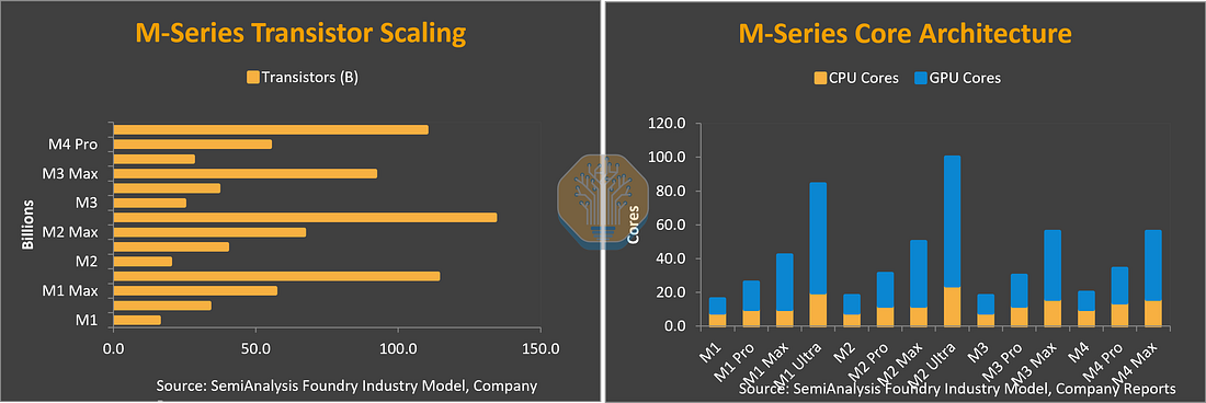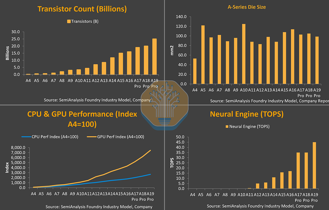 Apple’s remaining advantages: larger SLC (32MB vs 8-10MB), true unified memory with full CPU/GPU coherency, and vertical integration enabling thermal co-design. The gap has narrowed, but Apple still holds the efficiency crown. Next we’ll dive further into specifics: Apple wafer demand and economics at TSMC, including our forecasts through the end of the decade at the A14 node. We’ll quantify Apple N2 demand and how that affects their need for older nodes - surprisingly, som older nodes are seeing increased demand from Apple. More numbers are shown for demand by chip and you’ll see the change as the company (tried to) diversify beyond the iPhone. We’ll also put numbers on the HPC phenomena as, discussed earlier, Nvidia demand encroaches Apple at the leading edge. And there’s more: packaging economics, what TSMC’s ex-Apple business looks like, Apple’s in-house efforts to replace Broadcom modems, competing efforts to copy Apple’s vertical integration, a look at the trickle down effects in the supply chain beyond TSMC, and what the future of the TSMC + Apple partnership looks like. Apple Wafer DemandBy Node, Chip, and Device; Apple’s Wafer Economics at TSMC...Subscribe to SemiAnalysis to unlock the rest.Become a paying subscriber of SemiAnalysis to get access to this post and other subscriber-only content. A subscription gets you: