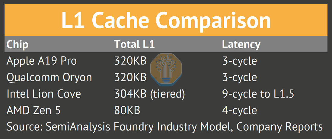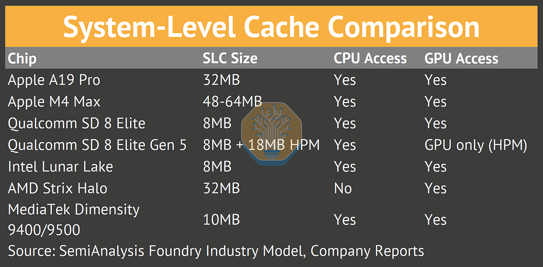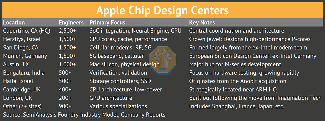 Global Design OperationsApple operates 8,000+ chip engineers across 15+ design centers on four continents: Israel is where Apple’s CPU performance leadership is designed. The Herzliya team, many recruited from Intel Israel, which created Pentium M, Core, and Sandy Bridge architectures, designs the Firestorm, Avalanche, and Everest cores that dominate benchmarks. The same country that gave Intel its best architectures now designs Apple chips that beat Intel. The San Diego facility is squarely targeted at Qualcomm. Apple’s modem design operation sits literally down the street from Qualcomm’s headquarters. The office is staffed largely with ex-Qualcomm and ex-Intel engineers, people who know exactly how Qualcomm’s modems work and how to beat them. DTCO: Design-Technology Co-OptimizationApple co-defines the Process Design Kit (PDK) with TSMC. TSMC effectively dedicates hundreds of engineers to Apple, creating what is essentially a “virtual IDM” (Integrated Device Manufacturer). When Apple dictates a need for wider memory buses or specific transistor architectures, TSMC adjusts the PDK to match. Silicon Performance EvolutionThe Relentless March of the A-Series and M-SeriesThe result of this manufacturing dominance is a performance lead that has compounded over a decade. Apple’s ability to move to the next node first allows it to pack more transistors into the same thermal envelope, maintaining a performance-per-watt lead over the x86 ecosystem. The transistor count growth is linear, but performance per watt is the real metric. The shift to N3E in the A18/M4 generation prioritized cost and yield over pure density scaling (compared to N3B), which explains the relatively modest transistor count jumps compared to previous generations. The Neural Engine has seen the most exponential growth, jumping from 0.6 TOPS in A11 to 35 TOPS in A17/A18, reflecting Apple’s strategic pivot to on-device AI years before the “AI PC” hype cycle began. Since 2013, Apple has consistently shipped industry-first features 12-24 months ahead of competitors. Apple Silicon Technical AdvantagesApple’s performance leadership stems from architectural bets made a decade ago. While Intel and Qualcomm chased 5GHz+ clock speeds, Apple pursued ‘wide and slow’, executing more work per cycle at lower frequencies. Front-End Architecture: Decode Width ParityApple introduced 8-wide decode with A14/M1 in 2020, four years ahead of competitors. But by 2025, the competitors caught up. Decode width is no longer Apple’s moat. The advantage has shifted to cache hierarchy, vertical integration and extremely efficient smaller E-cores. Cache Hierarchy: Where Apple Still LeadsApple’s philosophy: massive fast L1, large shared L2, and a System-Level Cache (SLC) before DRAM. The SLC allows CPU, GPU, and Neural Engine to share data without hitting slow system memory. Apple’s SLC advantage is 3-4x larger than competitors with full CPU/GPU sharing. AMD’s Strix Halo matches on size but CPU cores cannot access it. Apple and Qualcomm Oryon match on L1 size, latency and cache hierarchy, as the original Nuvia design team was largely poached from Apple. Intel’s L0/L1.5 tier structure adds latency. Unified Memory ArchitectureTraditional PC architectures have separate memory pools for CPU and GPU, requiring data copies. Apple Silicon uses Unified Memory Architecture: the GPU reads the exact same memory address as the CPU. This eliminates the “copy penalty” critical for AI workloads. A 20GB LLM loads once. The Neural Engine and GPU access it simultaneously. Qualcomm mobile chips use shared LPDDR5X but lack Apple’s fine-grained coherency. AMD Strix Halo’s MALL is GPU-only. Vertical IntegrationApple’s efficiency edge comes from owning the less attractive silicon: custom Power Management ICs and storage controllers enable millisecond-level dynamic voltage and frequency scaling. The chip races to sleep, completing bursts at high power and dropping to near-zero idle faster than x86 competitors. The iPhone 17 Pro’s vapor chamber was co-designed with A19 Pro’s thermal envelope. Apple knows the exact sustained power budget (5-7W) and designs the chip accordingly. Qualcomm must design for worst-case thermal across Samsung, Xiaomi, and OnePlus implementations. What’s changed in 2024-2025: