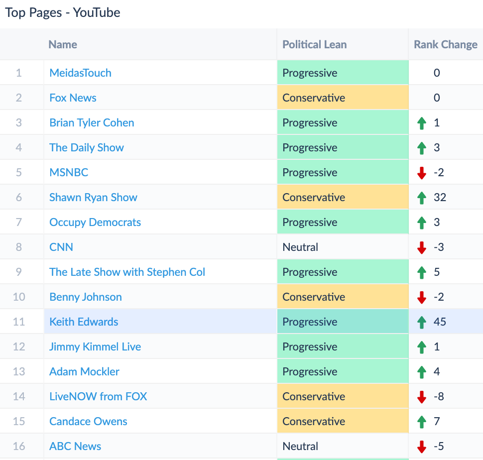 What I Learned Building a Progressive YouTube Channel in 2025The early growth strategy: Test → iterate → buildAt the start of 2025, I committed to doing this full-time. With 220,000 subscribers and a background in production and branding, I gave the channel a name: The Keith Edwards Show. I added editors, graphics, and a studio. At first, I didn’t try to reinvent the wheel. I looked at what high-performing progressive channels like MeidasTouch, David Pakman, and Adam Mockler were doing, then tested similar formats and iterated. Repetition and consistency built traction. By the end of the year, I hit 1.1 million subscribers, and had a real business. In July 2024, I committed to posting one video a day, and that consistency paid off. My channel grew from 5,000 to 100,000 subscribers that month, helped by being in the right place at the right time amid Biden’s withdrawal from the race and the attempted assassination of Trump. My first viral video was about Trump’s attempted assassin, which racked up 80,000 views. There’s a common misconception that lo-fi production equals authenticity, which an audience will reward with engagement. That’s not true. Early on, I filmed in my bedroom, and it admittedly looked ugly and unprofessional. When I pivoted to full-time and invested in a studio, viewership surged. It was a game changer. Presentation really matters—especially since my viewers are watching me on their TVs, where I’m competing with movies and TV shows. From growth to voiceOnce the numbers were there, I wanted the tone and presentation to match the kinds of conversations I actually want to have. I’m now trying to move away from clickbait thumbnails and outrage-driven headlines. The content is still sharp, but now it looks sharp, too.That shift has cost me some casual drive-by clicks. But that’s fine. What I’m building now is hopefully more durable: an audience that feels like a community, not a funnel. Other large progressive channels are starting to shift their tone and packaging too. That’s good. Because while the right is insane, they know how to make their content look approachable. Ours often doesn’t. Nobody wants to share a video—no matter how good it is—when the thumbnail is Trump’s face and the title is dialed to 12. I’m betting that nuance and honesty win long-term. And so far, the engagement trends suggest that bet is paying off. Before: After: What works now (and what doesn’t)Political YouTube is still evolving. But there are a few things I’ve learned the hard way: