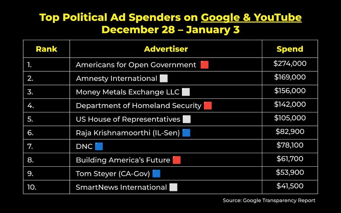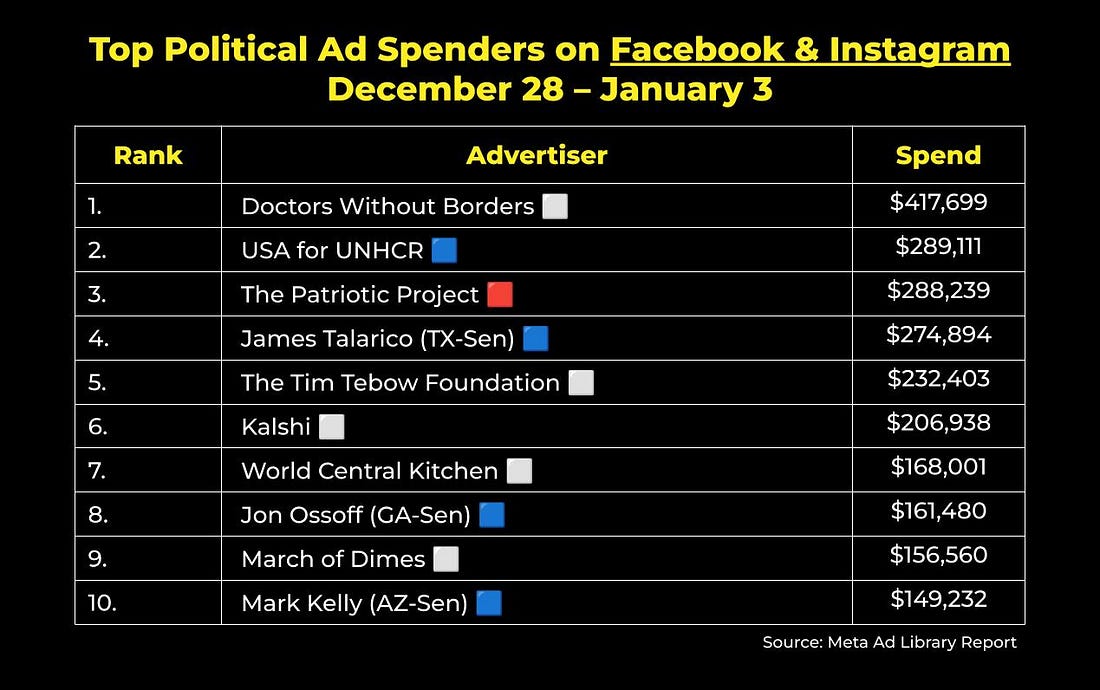 Keith Edwards: What I Learned Building a Progressive YouTube Channel in 2025Algorithms change. Audiences evolve. Authenticity still matters.This newsletter is brought to you by the donor acquisition approach that helps you turn $1 into $2. I’m Keith Edwards. I’ve worked in politics for years—on campaigns, causes, and comms strategy. But this past year, I did something new: I became a full-time YouTuber. It’s been a crash course in how digital influence actually works now. I’ve posted hundreds of videos and grown an audience from zero subscribers to a million in 15 months. Today, I reached half a billion views. Now, strangers will come up to me and say they watch my channel. That part was a surprise. In the past year, I’ve learned more about audiences, about trust, and about what kinds of political content actually break through in a fractured, chaotic media ecosystem than I ever did working as a political operative. I made a video highlighting some of my takeaways from the past year, and wanted to write some of them down and share them with you all here. More on that below, but first… Digital ad spending, by the numbers:FWIW, U.S. political advertisers spent just under $11.2 million on Facebook and Instagram ads last week. Here were the top ten spenders nationwide: Three Democratic senate candidates, Talarico, Ossoff, and Kelly, cracked the top 10 list, collectively spending over half a million dollars on Meta ads last week. The GOP side of the aisle was notably absent, perhaps focusing their efforts on a different platform (see below). Humanitarian groups, which made up about half of this list, ran some serious end-of-year fundraising campaigns, outspending politicians by a mile. Doctors Without Borders dropped more money last week than any two senate candidates combined. Meanwhile, political advertisers spent about $2.3 million on Google and YouTube ads last week. These were the top ten spenders nationwide: ICYMI: Tom Steyer, who famously spent over $250 million during his 2020 presidential campaign only to come in third with 11% of the vote and no pledged delegates, is now running to succeed Gavin Newsom as governor of California. He spent less than $54K on Google and YouTube ads last week, but it’s safe to say, we can expect that number to get a lot higher in the coming days. On X (formerly Twitter), political advertisers in the U.S. have spent just $6,700 on ads in 2026 so far. According to X’s political ad disclosure, here are the top spenders year to date… very much presented without comment, but if you’ve been on Twitter/X lately, this won’t come as a surprise: Snapchat has not yet shared its political advertising data for 2026. What if you could raise more in 2026?