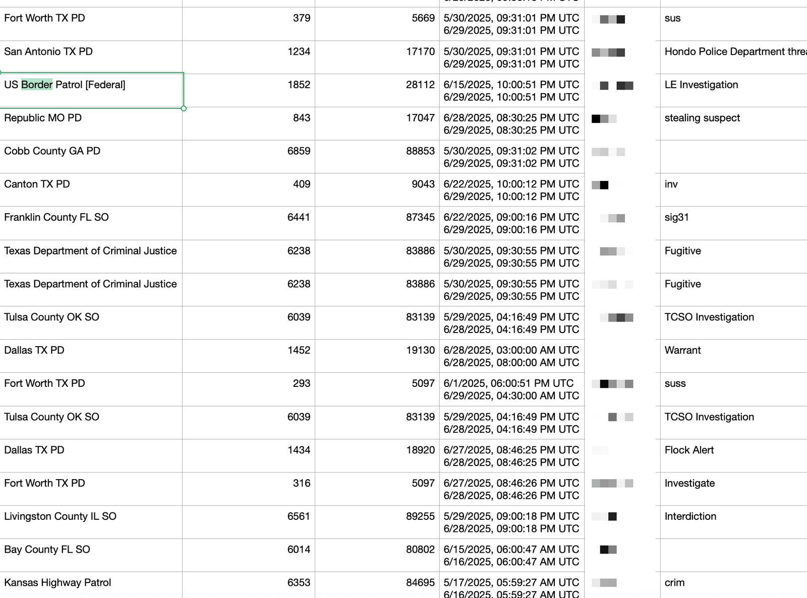 Hey there, Here's a tricky story that I've been working on for a while, which highlights just how much everpresent Flock is, and how fragile that data ecosystem is. -Jason A handful of police departments that use Flock have unwittingly leaked details of millions of surveillance targets and a large number of active police investigations around the country because they have failed to redact license plates information in public records releases. Flock responded to this revelation by threatening a site that exposed it and by limiting the information the public can get via public records requests. Completely unredacted Flock audit logs have been released to the public by numerous police departments and in some cases include details on millions Flock license plate searches made by thousands of police departments from around the country. The data has been turned into a searchable tool on a website called HaveIBeenFlocked.com, which says it has data on more than 2.3 million license plates and tens of millions of Flock searches.