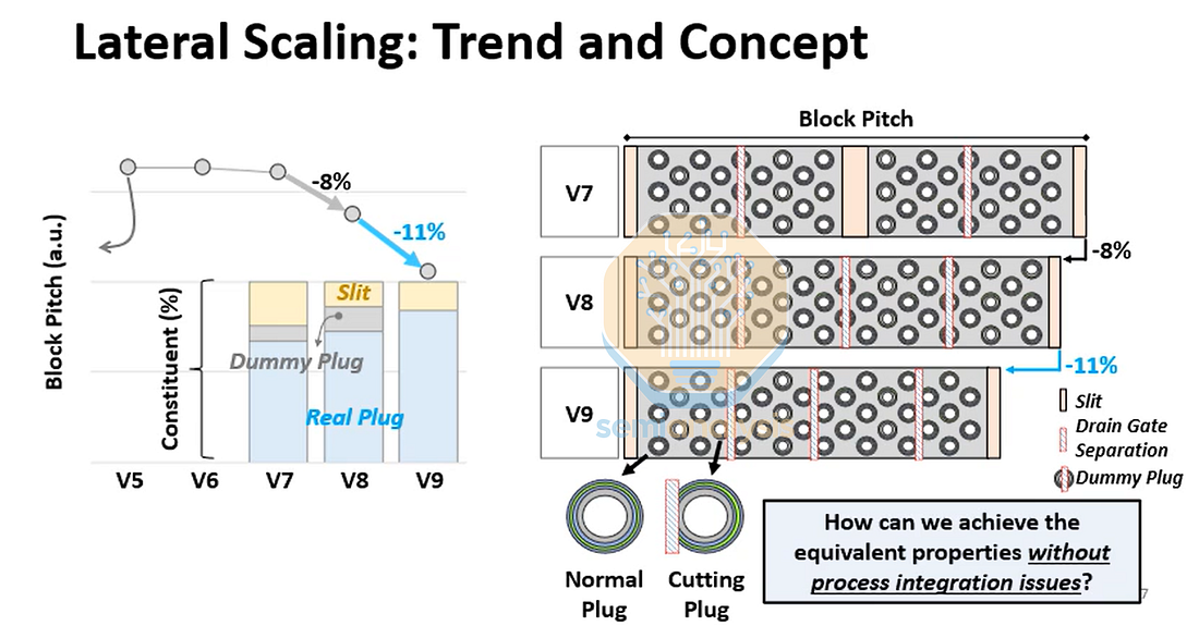 Remember that NAND is just about cramming as many storage cells onto the wafer as possible. This manifests in 3D NAND as vertical cylinders, channels, packed tightly together like trees in a forest. Flat layers, alternating between conductive and insulating material, surround these channels. A memory cell is formed at each intersection of channel and conductive layer. The memory cells are read and written based on charge held in a charge trap material, a layer surrounding each of the vertical channels. Charge stored there changes the threshold voltage (i.e. minimum voltage required to switch the transistor on) of the transistor. The cell can be read as 1 or 0 based on whether it switches at a given threshold voltage. Memory producers today are primarily focused on scaling option 2, vertical scaling, because it’s the cheapest. Adding more layers means more memory cells per unit area of wafer. Cheapest does not mean easiest. There are many, many challenges to increasing NAND layer count, and that’s why it’s interesting when one of the major companies share some of their techniques for doing so. The major change from the 238-layer V8 generation to Hynix 321 layer V9 is an additional deck and plug. A deck is a stack of horizontal layers, alternating conductive and insulating layers, that is processed all at once. The layers are deposited, patterning and partial etch of the contacts is done (a contact is needed at each conductive layer to access the transistors gated by that layer – this is the wordline of the memory), and the channel holes are etched and filled with polysilicon and the charge trap layer surrounding it. The “plug” term you see in the images denotes this completed, filled channel that plugs the hole. This is the process for completing a single deck. More decks can be made by repeating the entire cycle again, atop the existing deck. This is difficult too since the decks need excellent alignment to each other – the new plugs must be built directly over existing – as the wafer starts to warp and bend as stresses build up from hundreds of imperfect layers deposited atop each other. Most of the Hynix paper here was concerned with better connecting decks and dealing with nearly 100 additional layers. They claim to be using low stress materials, improved overlay control, and “locally forced” control (possibly a backside stress control film). Etch and other processing steps become increasingly difficult as you try to do more layers in one deck. The limit for Hynix appears to be about 120 layers. The channel etch is difficult to yield a straight, uniform cylinder with an aspect ratio ~1:100. This requires the high aspect ratio etch tools, now using cryo etch, that Lam traditionally dominated but TEL is encroaching on. It’s one of the most important and difficult to produce tools used in NAND production. When the number of layers per deck can’t be increased, the number of decks must be increased instead. This adds a lot of processing steps. From V8 to V9, Hynix says there are 30% more process steps overall and 20% more etch steps. Don’t get too excited, WFE bulls, the layer increase was close to 35%, so layer count is increasing faster than processing steps. While the technology is interesting, the commercial position of Hynix’s 321L V9 product isn’t great. Its 21 Gb/mm2 is comparable to Micron 276L G9, but Micron achieves that density with only 2 decks, which will be substantially lower cost. Meanwhile Sandisk/Kioxia’s upcoming 332L BiCS10 with 3 decks will be far denser, 29 Gb/mm2 for TLC (detailed explanation below of what TLC means) and QLC demonstrated at >37 Gb/mm2. Still, the WFE intensity increase and methods for producing 3-deck stacks should be generally similar across SK Hynix, Micron, and Samsung. Note that Samsung is skipping 3xx layers altogether, going from 286L 2-deck in V9 to 43x layers, 3 decks in V10. 3D NAND: Samsung MolybdenumAt IEDM, Samsung presented an improvement to their existing V9, 286 layer technology. From V5 on, they’ve used tungsten (W) as the wordline metal, in other words the gate metal in the memory bit cell. Here, they showed a serious performance improvement by switching to molybdenum (Mo). Mo is more difficult in pretty much every way – chemically, mechanically, electrically – versus manufacturing with W. The ALD chemistry is not as mature for Mo, and it readily oxidizes, which degrades performance. Deposited Mo tends to have greater stress variability, due in part to less mature ALD processes, which make it more likely to warp or even crack wafers. The benefits are worth the trouble: Samsung claims contact resistance is reduced by 40% with Mo, which is crucial when trying to read an already small current that must flow through 300+ cells in series, each with its own contact resistance. Read time is improved by more than 30%, and failure rate in lifetime testing reduced by 94%. They haven’t detailed every challenge in the Mo integration and how it was solved, but they do note the ALD chemistry, which is interesting. They do not directly deposit molybdenum, instead growing a seed layer of MoN which is then converted to pure Mo. Atop a pure Mo seed layer, thicker bulk material can be grown, resulting in a linerless, high quality Mo layer. Liners are traditionally needed to prevent metals from migrating and degrading over time, but they are not conductive and take up real estate. A linerless process can enable both better performance and further shrink in future nodes as well. Lam is dominating Mo deposition tools, taking share from AMAT W tools and beating out TEL and others. Layer scaling is the easiest and most cost-effective way to scale 3D NAND at the moment, but chipmakers are still pursuing the other methods listed above. The most exciting paper in the NAND track was on one of these other methods: SK Hynix showed a new method for logical scaling. 3D NAND: SK Hynix Multi-Site Cell / 5 Bits-Per-CellAbove we 