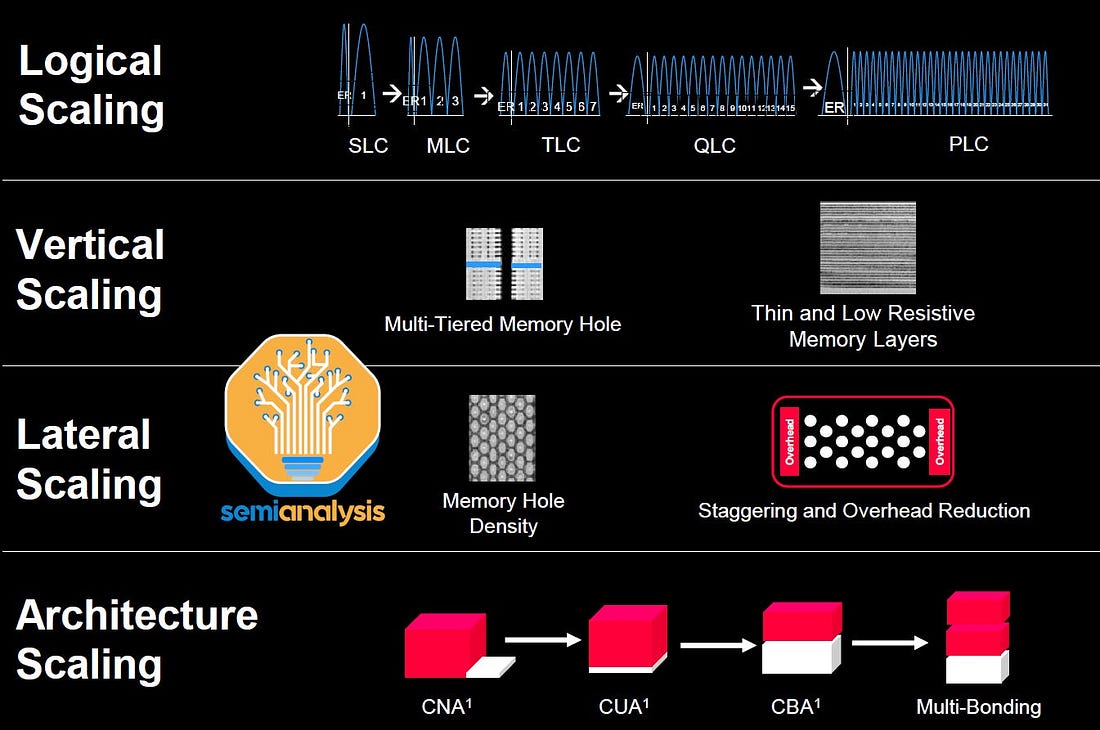 It’s an odd time in the chipmaking industry. On one hand, we are ramping into the biggest supercycle ever seen. Advanced logic, DRAM, NAND, customers can’t get enough, chipmakers can’t build capacity fast enough, and we may soon be limited by fab equipment supply. On the other hand, the rapid technology improvement in scaling, power consumption, chip cost, etc. have slowed to a crawl. Massive research efforts yield small incremental gains. As costs increase but improvements asymptote and scaling runs out of room at the bottom, it sometimes feels like Moore’s Law has become Moore’s Wall. The good news is the semiconductor industry has a long history of making naysayers look stupid in the long run. There are plenty of innovations on the bench that are promising for the next decade and beyond. In this report, as with 2022, 2023, and 2024, we’ll cover highlights from IEDM 2025 to find out what the future of chipmaking might look like. With memory prices exploding, 3D NAND technology is suddenly relevant again. We’ll look at the technology and competitiveness of SK Hynix’s latest V9 NAND, Samsung’s use of Mo to improve its existing V9 products, and a big innovation that we may see in future production from SK Hynix. For advanced logic, we’ll look at interconnect metals beyond Cu, the potential of 2D materials to replace Si in transistors, and the progress in CFET, the next big inflection after gate-all-around. 3D NANDNAND scaling is critically relevant right now, as demand is spiking but there is no cleanroom space for building out capacity. Memory producers are limited to upgrading existing lines, so their supply is constrained by how dense their upgraded process is. For leading fabs, this is a 3xx-layer 3D NAND process, which yields on the order of 20-30 Gb/mm2 of memory. That pencils out to 30+ TB of memory on a single 12” wafer (note the difference between (b)its and (B)ytes in these abbreviations). 3D NAND: Hynix 321 LayerIn the case of SK Hynix, the 321-layer process has 44% more memory per wafer than the previous generation 238-layer technology. If you are constrained by cleanroom space and by extension the number of wafers you can produce, 44% more memory on each of those wafers makes upgrades an obvious choice. We’ve written in detail about NAND scaling methods, as a quick recap: