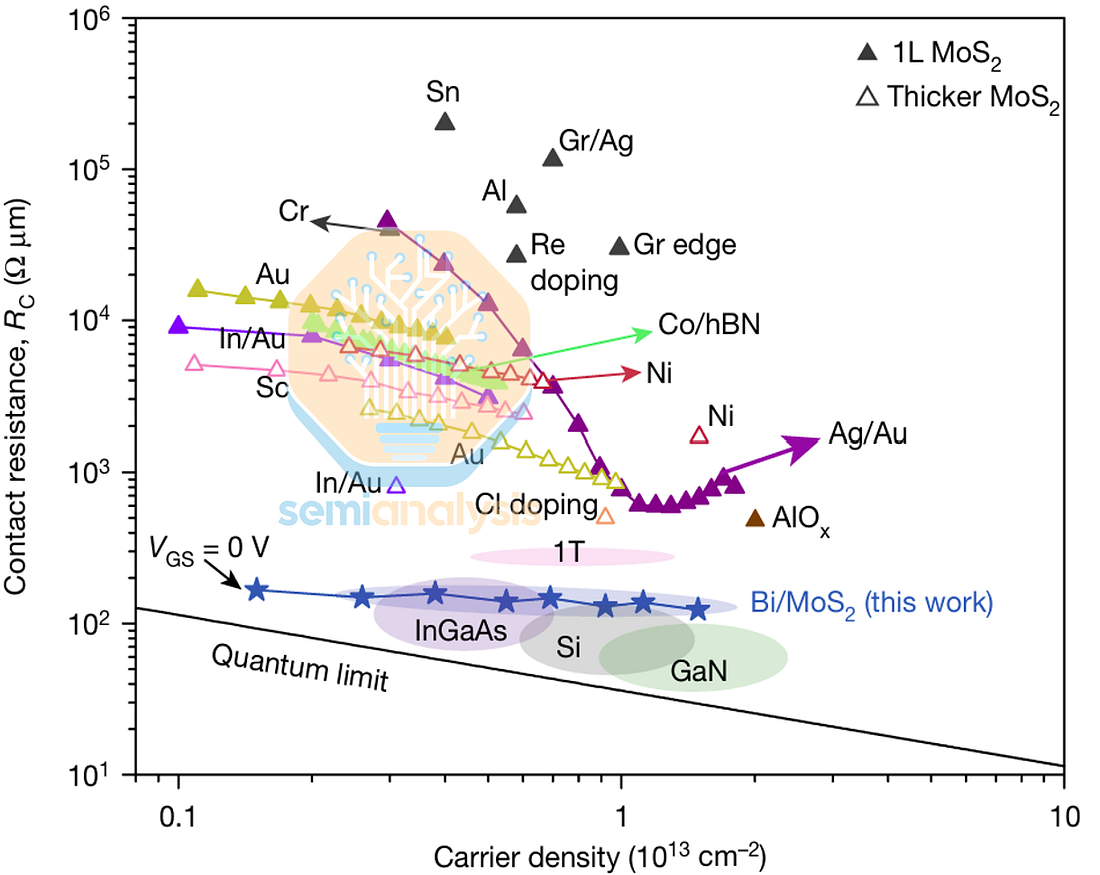 2D Materials2D transition metal dichalcogenides (TMDs) keep resurfacing in logic discussions for the same reason silicon keeps getting punished as gate lengths push into the sub-10 nm regime. Once channels and electrostatics are forced into ultra-thin geometries, off-state leakage stops being a design nuisance and starts becoming a physics wall, driven by direct source-to-drain tunneling. TMDs remain one of the few plausible levers to keep leakage under control because the combination of a larger bandgap and higher effective mass suppresses tunneling. That matters precisely where conventional silicon FETs begin to leak badly at very short gate lengths. The catch is that this is no longer a monolayer physics story. It is a manufacturing story. The first gating factor is high-volume manufacturing: no matter how elegant the device architecture looks on paper, the industry only gets paid when it can repeat the same outcome across a 300 mm line. Many synthesis conditions used to achieve high-quality 2D films come with steep integration penalties, including growth temperatures that can exceed ~800 °C, plus broader environmental and safety concerns tied to precursors and chemistries. That is why the practical near-term path has increasingly emphasized transfer-based integration at relatively low temperatures, with IMEC’s 300 mm-compatible dry transfer highlighted this year as a way to mitigate void formation and improve post-transfer uniformity. At the same time, transfer remains hard to scale for real semiconductor manufacturing. Direct growth on 300 mm target wafers is still the long-term target, not an optional nice-to-have. Once you accept that the near-term battle is integration, the next battle is even more unforgiving: contacts. Performance must improve to meet industrial requirements, and contact resistance has always been the focal point because it determines whether the device is contact-limited. Plenty of prior work reports low n-type contact resistance for MoS₂ under specific contact schemes, but the fine print is that these results are often demonstrated at high VGS and VDS, which is not the bias regime that matters for products. The relevant target regime is low voltage operation, with |VGS| < 1 V, |VDS| < 0.1 V, and contact resistance Rc < 100 Ω·µm. That reframes the goal: you need high carrier concentration at low bias so Rc can move toward the quantum limit under realistic operating conditions, not just under overdrive. CMOS viability then runs into the familiar asymmetry problem. P-type TMD FET performance remains inadequate and is generally inferior to n-type counterparts, and the gap looks tied more to processing defects and interface physics than to a simple lack of effort. In practice, p-type behavior can drift toward n-type due to defects introduced during processing, which degrades hole injection and drives p-type Rc upward. Prior studies repeatedly point to Fermi-level pinning as a core mechanism, where pinning tends to anchor the Fermi level closer to the conduction band edge than the valence band edge. That increases the effective p-type Schottky barrier height and impedes hole injection. Other work highlights interface dipoles at the metal-TMD interface as another source of unwanted potential shifts that further suppress p-type injection. The implication is straightforward: high p-type Rc is still a first-order bottleneck, and p-type engineering has to catch up before “CMOS with TMDs” can be more than a slogan. Even if you solve contacts and polarity symmetry, the next constraint is not a heroic single-device metric. It is variability, driven by film quality and layer control. Transfer-related and manufacturing-related damage remains visible: low transfer yield and structural damage such as stacking faults, vacancies, and other crystallographic imperfections are frequently introduced during processing. Layer count adds another variability axis. As the number of layers increases, the bandgap generally narrows and often transitions from direct (monolayer) to indirect (multilayer), which changes electrical characteristics materially. Multilayers can be more mechanically robust during fabrication, and multiple transport paths can reduce the apparent sensitivity to localized defects. That is why multilayers can look like a pragmatic engineering compromise. The catch is that controlling bi-layer, tri-layer, or thicker TMD growth is still difficult, often producing mixed monolayer/multilayer regions and stacking sequence errors that widen device distributions even when the average device looks fine. The scaling argument that keeps TMDs on the table is being framed more explicitly this year in the context of gate-all-around (GAA) nanosheet transistors. Shrinking physical gate length below ~10 nm effectively forces channel thickness to well under ~5 nm if you want to sustain subthreshold swing below ~70 mV/dec. If you cannot hold subthreshold swing down, you either accept excessive off-state leakage or you raise operating voltage. This is the silicon problem in its most concrete form: at sub-10 nm, conventional Si FETs see off-state leakage rise sharply because source-to-drain tunneling ramps. TMDs are positioned as a way to blunt that tunneling through bandgap and effective mass, keeping off-state current lower in the same geometry. Threshold control and doping then become the next translation barrier because the silicon toolbox does not port cleanly. There is still no practical, reliable substitutional doping technique for TMDs at the level the logic industry would call “manufacturable,” likely due to poor dopant incorporation and stability. Ion implantation, the workhorse in silicon, can severely damage 2D materials and introduce defects that degrade mobility and device lifetime. In that environment, many studies lean harder on work-function engineering and interface physics: careful selection of contact metals for both n-type and p-type devices, Vt tuning 