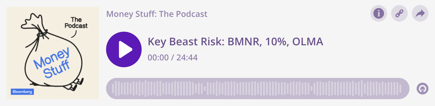 | This week’s episode of the Money Stuff podcast is out now, in which Katie and I discuss Beast Industries, immersion in cool liquids, crypto treasury pivots, credit card rate caps, PowerPoint tips and drug trial insider trading. You can listen to this week’s episode here: You can get Money Stuff: The Podcast at Apple, Spotify or wherever you get your podcasts. We’d love your feedback. You can email us at moneypod@bloomberg.net. |