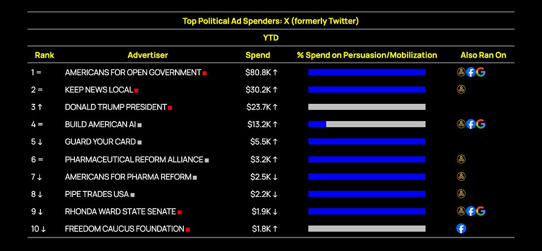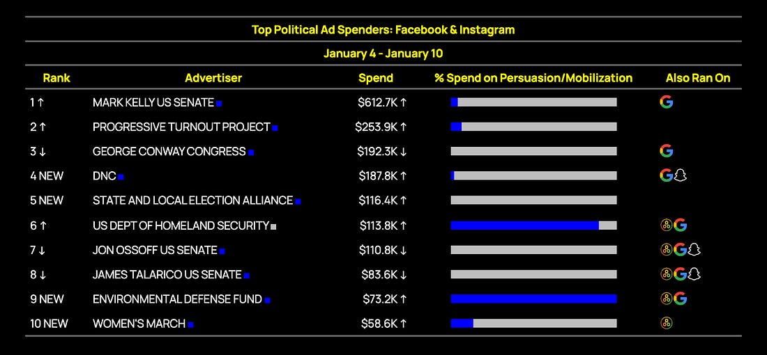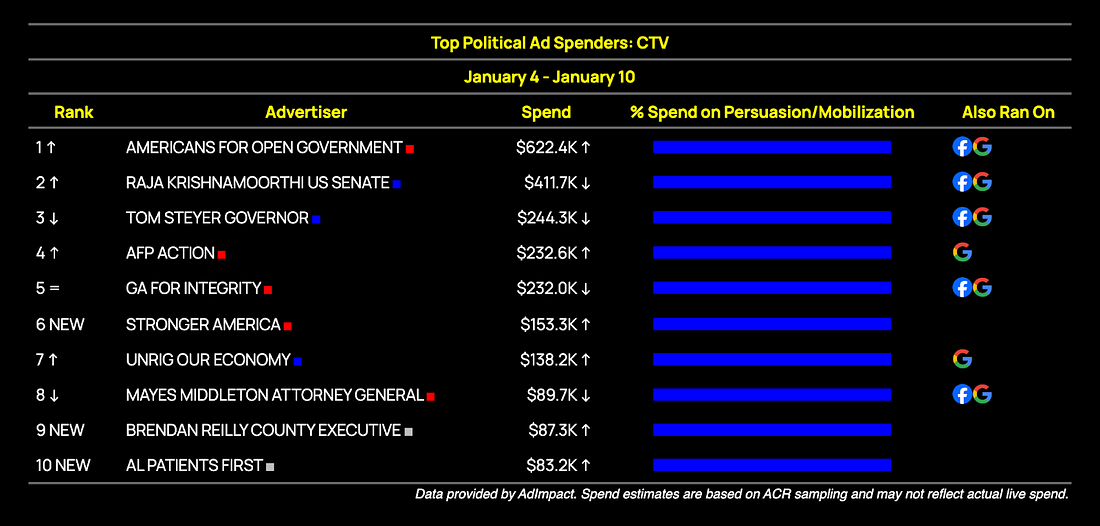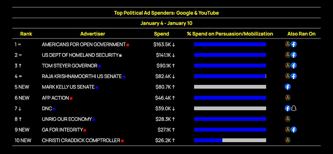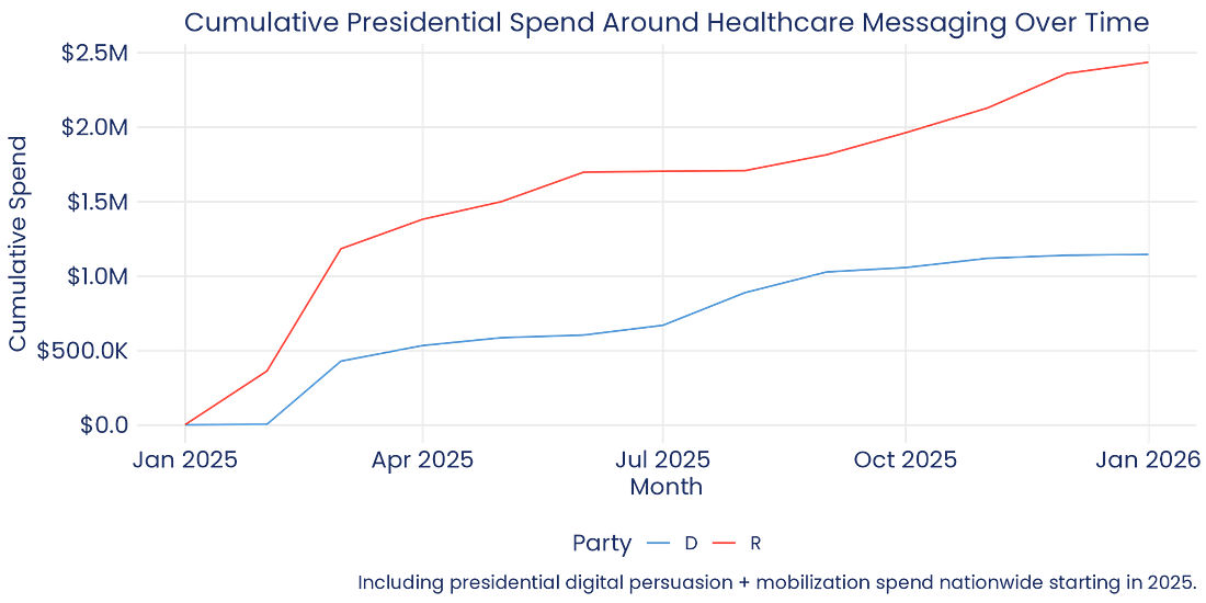 Republicans' New Health Care Strategy: Lie Loudly. Lie Often.We Don’t Have to Let Them Get Away With ItThis newsletter is brought to you by the donor acquisition approach that helps you turn $1 into $2. Hi! I’m Danielle Butterfield, Executive Director of Priorities USA and today’s guest author. I got my start working on digital ads back in 2011 on the Obama campaign but joined the Priorities team in 2017, and became our ED in 2021, where I became obsessed with advancing the Left’s digital communication strategy through training, tools, and more creative experimentation. Today, I want to talk about health care, the issue that got me involved in politics. When my dad was diagnosed with cancer in 2007, he had to spend more time on the phone with insurance companies than fighting the disease itself. The 2008 Democratic primary was unfolding at the same time and I saw how much Democrats across the spectrum wanted to make real policy change - I knew right away I had to get involved. Right now, the subsidies fight is looming large, with GOP and Dem health care messaging becoming almost indistinguishable. I thought I’d walk through how we got here, and where we go from here. More on that below, but first… Digital ad spending, by the numbers:As part of today’s takeover, we are experimenting with some new paid media data charts (h/t AdHawk, the competitive dashboard the Priorities team built to make this data easier to understand and act on). FWIW, U.S. political advertisers spent $3.6 million on Facebook and Instagram ads last week. Here were the top ten spenders nationwide: Democrats outspent Republicans significantly on Meta this week, with Senate candidates Ossoff and Talarico remaining in the top 10. Sen. Mark Kelly leaned into his potential 2028 candidacy, with a more than 5x increase in his fundraising spend over last week. We expect this momentum to continue, especially in the wake of his newly-announced lawsuit against the Department of Defense. But Sen. Kelly isn’t the only 2028 contender who’s fundraising well ahead of a candidacy announcement: check out these spots from former Secretary of Transportation Pete Buttigieg’s Win the Era PAC. On Google, political advertisers spent $1.3m last week. As was predicted in last week’s FWIW, Tom Steyer has ramped up spending across all platforms in the rapidly-heating California governor’s race. Former Rep. Katie Porter and Rep. Eric Swalwell are both up with fundraising spots, but their overall spend is dwarfed: Steyer at $350k overall in the last week, Porter with $3.3k, and Swalwell with $1k. On X (formerly Twitter), political advertisers have spent $289K this year. With X’s rightward tilt (understatement), it’s a place where electoral persuasion has gone to die. Instead, it’s become a home for MAGA-focused advocacy. One of the major campaigns reflecting that trend so far this year is Build American AI, a $10m effort advocating for a pro-AI federal regulatory framework. Most of their ads so far have been listbuilding, but there is a hint of subtle persuasive messaging on the horizon. With that much cash to spend, we might just see a first-party targeting pivot. What if you could raise more in 2026?