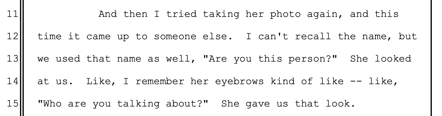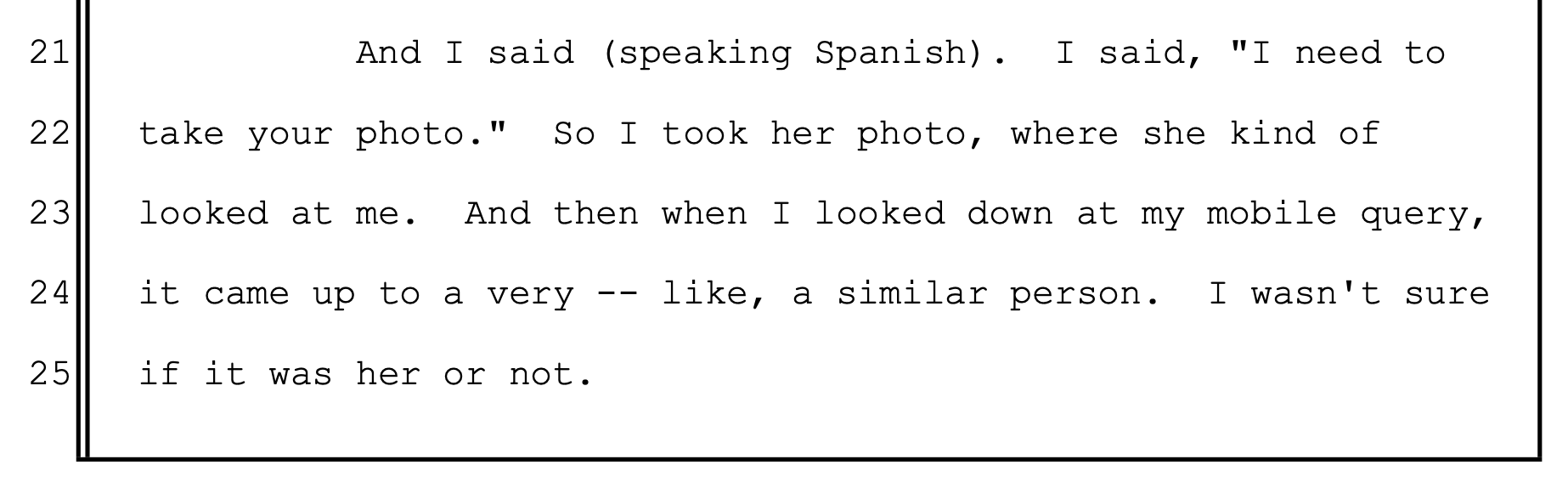 The incident involved a 45-year-old woman who court records call MJMA. She was detained with more than 30 other people during a raid in Woodburn after authorities smashed a van’s driver side window and pulled her from the vehicle. MJMA is now suing ICE and being represented by attorneys from the Innovation Law Lab. 💡 Do you know anything else about this app? Do you work at ICE or CBP? I would love to hear from you. Using a non-work device, you can message me securely on Signal at joseph.404 or send me an email at joseph@404media.co. Oregon Live briefly mentioned the face scan in a December report. 404 Media has now obtained the CBP official’s full testimony. The CBP official, called MK in the transcript, said she was trying to determine the woman’s immigration status. MJMA was refusing to answer questions. “So then, in order to [...] to use another tool that I had to identify her, I took my government cell phone out of my pocket. It has the little facial recognition mobile query for CBP. And I took a photo [...] I tried to take a photo of her face, and she looked down,” MK said. Another part of the transcript specifically names Mobile Fortify. “So then I remember I moved her shoulder back. And she complained because I did forget she had handcuffs on and [...] like, behind her back. And she kind of, like, yelped, like if I had caused pain, like a lot of pain. So then I apologized. I said (speaking Spanish), which is 'I'm sorry,' (speaking Spanish),” she continued. MK said she explained to the woman she needed to take her photo. “So I took her photo, where she kind of looked at me. And then when I looked down at my mobile query, it came up to a very [...] like, a similar person. I wasn't sure if it was her or not.”  A screenshot of the testimony. The first name the app returned was Maria, according to the testimony. “It matched to someone [...] I remember saying, ‘Maria? Like, is this Maria?’ And then at that point there was other ICE agents around me. So they were like ‘Maria, Maria,’ to see if she would respond because, again, she was refusing to talk to us, which is her right.” After MJMA did not respond, either verbally or nonverbally with a change in her face, the CBP official scanned her face again. This time, Mobile Fortify gave a different name. “And then I tried taking her photo again, and this time it came up to someone else. I can't recall the name, but we used that name as well, ‘Are you this person?’ She looked at us. Like, I remember her eyebrows kind of like [...] like, ‘Who are you talking about?’ She gave us that look,” MK testified. MJMA again didn’t respond verbally, and instead crunched her eyebrows, according to the testimony. “And so then we were like, ‘Well, I don’t know. Possible.’,” the CBP official said.  A screenshot of the testimony. Stephen Manning, executive director at Innovation Law Lab, told 404 Media both of the names Mobile Fortify returned were incorrect. “The app returning different names for the same individual shows that it’s not reliable or accurate and shouldn’t be used in the field,” Homeland Security Ranking Member Rep. Bennie G. Thompson told 404 Media in a statement. Oregon Live reported that after authorities moved MJMA to an ICE detention center in Tacoma, they released her the next day without any conditions. She is suing to assert her Constitutional rights, according to Innovation Law Lab. In her own testimony, MJMA said she was issued a B-2 visa, which is a tourism visa, and last entered the U.S. with it last January. Manning said that MJMA is seeking asylum. “My job is to give people digital security advice and there is no advice I can give on this because you can’t change your face, and if you don’t submit to their demands ICE has demonstrated that they are willing to shoot you,” Quintin added. 404 Media first revealed the existence of Mobile Fortify in June based on leaked ICE emails. Since then 404 Media has obtained a user guide for the tool which explained the databases and images it uses; showed that both ICE and CBP officials are using the app around the country; and found the Department of Homeland Security (DHS) launched a version of the app for local law enforcement called Mobile Identify. That app was taken down from the Google Play Store in December. Mobile Fortify uses CBP systems ordinarily used to verify travelers as they enter the U.S., according to the leaked material. The app turned the capability inwards onto American streets. In partnership with Reveal, 404 Media reported the app has been used against U.S. citizens. 404 Media previously obtained an internal DHS document under the Freedom of Information Act which showed ICE does not let people decline to be scanned by Mobile Fortify. Last week a group of Democratic lawmakers introduced legislation, written by Rep. Thompson, that aims to rein in Mobile Fortify. That legislation would essentially kill the local law enforcement version of the app, restrict use of Mobile Fortify to points of entry into the U.S., and force DHS to delete images of U.S. citizens after 12 hours. Rep. Thompson previously told 404 Media, “ICE officials have told us that an apparent biometric match by Mobile Fortify is a ‘definitive’ determination of a person’s status and that an ICE officer may ignore evidence of American citizenship—including a birth certificate—if the app says the person is an alien.” Inaccuracy has long been a concern of facial recognition systems, and mistakes have led to innocent people being detained or charged with crimes. When facial recognition tools do make mistakes, it is often against people of color. “For over a decade, researchers have shown that facial recognition is a flawed technology that performs particularly poorly on women of color. Using it to determine a person’s status is inviting misidentifications and false positives,” Chris Gilliard, a privacy researcher, told 40