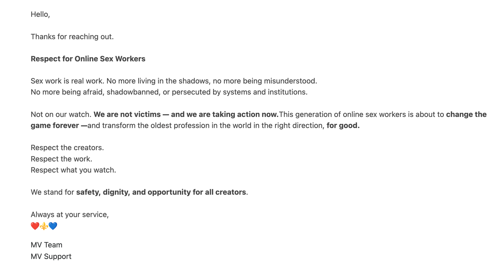 “We try to offer sex workers the tools to be more successful as independent entrepreneurs without being judged,” French told the Daily Beast in 2019. “What was really important for me was to educate the world and make them realize that porn stars are not stupid.” Shortly after she and I met in 2019, French agreed to a written interview as part of a VICE story about authenticity in cam work. In that email, she called camming the “biggest gift” she’d ever received. “Being a camgirl not only has a huge influence on my approach to taking business decisions but has changed the way I view people and life in general,” French wrote at the time. “Every single decision we take at ManyVids must answer 1 simple question, ‘Will this help the content creators, our MV Stars?’ That’s it,” French wrote in 2019. “If the answer is yes then we proceed, regardless if there is any financial advantage or potential for profit, that is irrelevant.” Platforms have long profited off of sex workers and pornography to establish popularity and rake in revenue before eventually doing a heel-turn on the creators who made them successful. We’ve seen it happen with mainstream social media platforms like Tumblr, Instagram, and Twitter, and also on sites ostensibly made for sex workers, like OnlyFans, which nearly changed its policies to ban explicit material after making billions of dollars off their content. I asked ManyVids and French if the platform is changing to reflect these social media posts and her statements on her bio, who is making the AI-generated posts mentioned above, how French plans to “transition one million people” out of sex work, and if any of this will affect creators and fans who use ManyVids. The ManyVids support team did not answer these questions specifically, but sent the following response (emphasis theirs): "Hello, thanks for reaching out. Respect for Online Sex Workers. Sex work is real work. No more living in the shadows, no more being misunderstood. No more being afraid, shadowbanned, or persecuted by systems and institutions. Not on our watch. We are not victims — and we are taking action now.This generation of online sex workers is about to change the game forever —and transform the oldest profession in the world in the right direction, for good. Respect the creators. Respect the work. Respect what you watch. We stand for safety, dignity, and opportunity for all creators."  Screenshot of the emailed response from ManyVids support I asked ManyVids to explain in specific terms what "we are taking action now" means. They replied: "A post will be published to our ManyVids News feed this Saturday, January 24th. It will provide additional clarification and go into a bit more detail on this," with a link to the feed. “It concerns me that access to my earnings, and more importantly my personal information, is in the hands of someone seemingly out of touch with reality.”