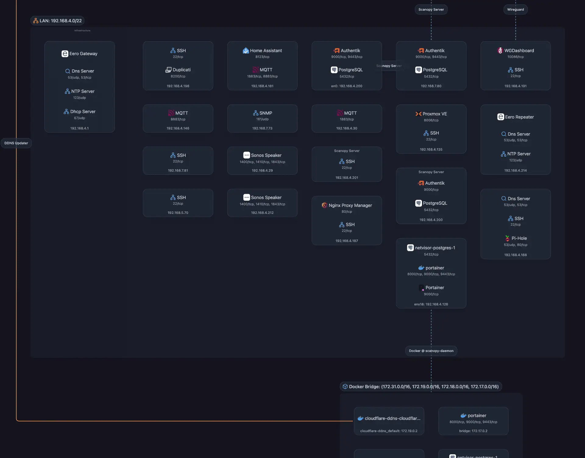 More From selfh.stContent SpotlightMeet Scanopy, a web-based network diagram and visualization platform. With Scanopy, users can easily generate interactive diagrams of hosts and services on their network via auto-discovery for monitoring, documentation, and sharing with others. Features include pre-defined service definitions for over 200 platforms, interactive and customizable diagrams, distributed scanning, Docker integration, multi-user support, and scheduled discovery. Scanopy can be easily deployed via Docker and requires a separate PostgreSQL container for data storage.
