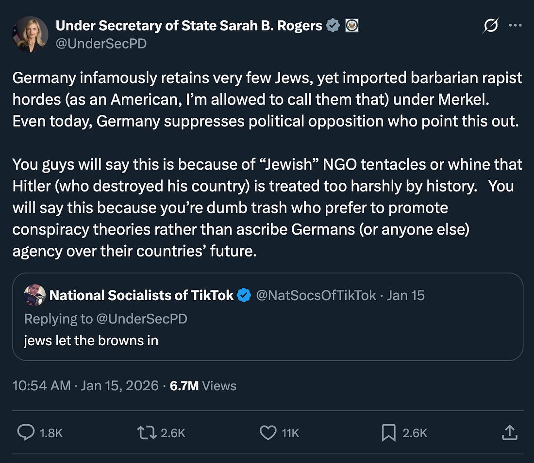 Okay, but what specifically got her banned? And, for that matter, what does “not racist in the sense that is morally pejorative” mean?! Sadly, the Gawker comments were wiped when the site was sold and its archives were moved, so we may never know. We have, at least, Rogers’ official State Department account, where you can find her recent response to the Twitter account “National Socialists of TikTok”: Ah, yeah, that sounds like a Gawker commenter who’d get bounced to the grays. 1 Present company excluded, of course: I love you guys. 2 Longtime commenters especially tend to develop a thwarted sense of ownership and blinkered sense of nostalgia about the sites on which they comment: A “Make Gawker Great Again” campaign would have really killed back in 2012. 3 I mean, I’m assuming that Rogers was Smith’s source for the September piece. It’s possible that there are two Trump appointees who were radicalized in the Gawker comments section. 4 This is obviously an insane thing to have done but is not even in the top ten most insane things that either a Trump administration appointee or a Gawker commenter has ever done. You're currently a free subscriber to Read Max. For the full experience, upgrade your subscription. |