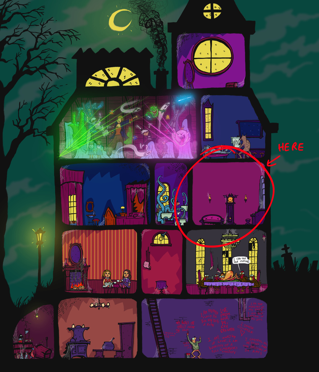 Our winning pick from “a house most haunted 7”: “Public mouse execution, either guillotine or hanging, your choice. Also, can we add more ghosts to the rave? If so, can you add Starscream’s ghost?” A close second was “A drunk mimic french kissing a barrel of wine” so I threw it in too! So now, suggest in the comments below what you think should be happening in the spot labeled above. It can be as much or as little as you want, it can feature ghosts, ghouls, skeletons, skellingtons, werewolves, wolf men, titties, additional scenery, whatever. Then I’ll pick some of my favorites along with the top comments (based on likes), and will have members of the Interactive Comics tier vote on which one of those suggestions should be picked and officially added to the illustration. We’ll keep doing this until the whole ass picture is jam ass full (of ass). Make sense? Still no?? OK LETS GO |