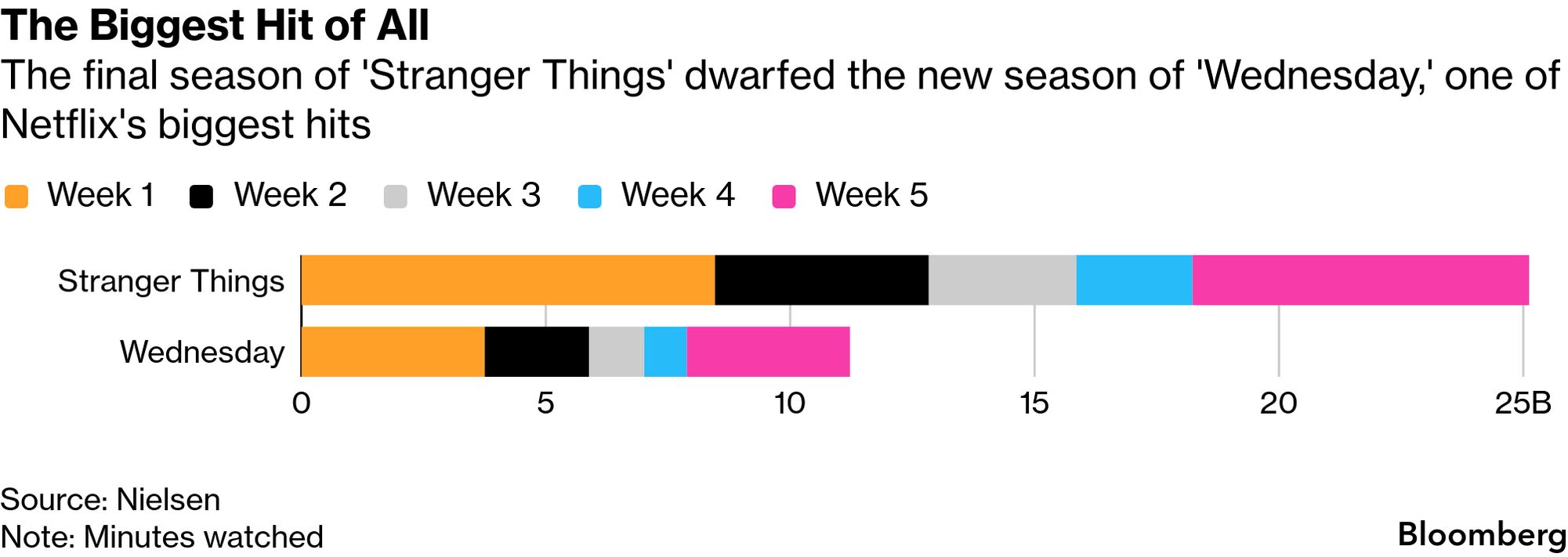 Netflix’s good news and bad newsNetflix shares sank after the company reported financial results for the fourth quarter of 2025. The company posted strong sales and earnings to close last year, but its forecast for 2026 was short on profit. Netflix cited two primary factors — a 10% increase in spending and costs related to its pending acquisition of the Warner Bros. studio and streaming businesses. Analysts were divided on how to interpret this. Some saw Netflix as pressing its advantage, spending more on programming and technology to push ahead of the competition. Others saw a company that is struggling to sustain its growth — and buying Warner Bros. to help solve that problem. Netflix expressed optimism about its first month of video podcasts — what else would management say? — and described both YouTube and Instagram as competition in TV. (This advances their argument that buying Warner Bros. isn’t anti-competitive.) The company also dropped its latest “engagement report.” We will take a deeper dive into the numbers at a later date, but it is worth reflecting on the utter dominance of Stranger Things. Stranger Things is more popular than every other big hitThe second season of Wednesday was Netflix’s most-watched season of TV last year. But let’s compare Wednesday with Stranger Things, which debuted at the end of the year. Both shows were dropped in batches, which is why you see a spike in week five. ![]() Now some of this is because people are going back and watching older seasons of Stranger Things. Nielsen includes all seasons. So let’s compare Stranger Things with another Netflix hit that released its fifth season, Emily in Paris. ![]() The Heated Rivalry surpriseOver the past six weeks, the TV show Heated Rivalry has been the talk of my weekly tennis game and many a social gathering. It has been the subject of incessant press coverage, with some calling it a word-of-mouth sensation. And yet, the show didn’t appear in Nielsen’s weekly rankings. The Canadian hockey romance is less popular than Mayor of Kingstown and PAW Patrol. This is a classic coastal hit — buzzy and beloved by the media, but not a mass-market phenomenon. It’s still a huge success, especially considering how cheap it was for HBO Max. The streaming service is now negotiating for the rights to a second season — and the price has gone up. The Warner Bros. turnaround is almost completeSinners earned 16 Oscar nominations — the most of any movie in history. It will contend with One Battle After Another, the Paul Thomas Anderson film that has been seen as the favorite. Both movies were released by Warner Bros. A win on Oscar night will cap one of the most remarkable turnarounds in recent Hollywood history. Last March, Warner Bros. Discovery CEO David Zaslav was looking to replace studio chiefs Mike De Luca and Pam Abdy. Then they released a half dozen No. 1 films in a row — seven if you count F1 — and captured many major awards. Deals, deals, deals